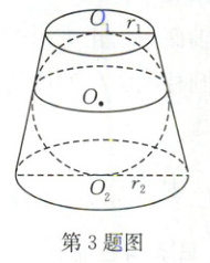 3. [2024·合肥六校联考]如图,已知球O内切于圆台(即球与该圆台的上、下底面以及侧面均相切),且圆台的上、下底面半径$r_{1}:r_{2}=2:3$,则圆台的体积与球的体积之比为 (