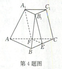 4. [2024·华南师大附中期中]如图所示,在上、下底面对应的边长之比为$1:2$的三棱台中,过上底面一边$A_{1}B_{1}$作一个平行于棱$C_{1}C$的平面$A_{1}B_{1}EF$,记平面分三棱台的体积为$V_{1}$(三棱柱$A_{1}B_{1}C_{1}-FEC$的体积),$V_{2}$(几何体$A_{1}B_{1}-ABEF$的体积)两部分,那么$V_{1}:V_{2}=$