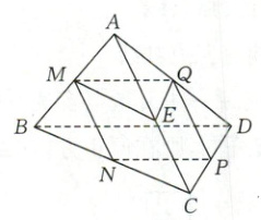 6.D [解析]由中位线定理,易知$MQ// BD,ME// BC,QE// CD,NP// BD$.对于A,由基本事实4易得$MQ// NP$,所以M,N,P,Q四点共面,故A正确;对于B,根据等角定理,得$\angle QME=\angle DBC$,故B正确;对于C,由等角定理,知$\angle QME=\angle DBC,\angle MEQ=\angle BCD$,所以$\triangle BCD\sim\triangle MEQ$,故C正确;由三角形的中位线定理及基本事实4,知$MQ// BD,MQ=\frac{1}{2}BD,NP// BD,NP=\frac{1}{2}BD$,所以$MQ// NP$,所以四边形MNPQ为平行四边形,故D不正确.故选D.