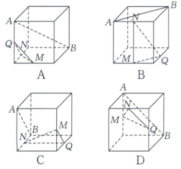 3. [2024·黄山调研]在下列四个正方体中,$A$,$B$为正方体的两个顶点,$M$,$N$,$Q$为所在棱的中点,则在这四个正方体中,直线$AB$与平面$MNQ$不平行的是(