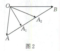 (2)如图2,设$A_1,A_2$是线段$AB$的三等分点,$\triangle OAA_1,\triangle OA_1A_2$及$\triangle OA_2B$的重心依次为$G_1,G_2,G_3$,试用向量$\boldsymbol{a},\boldsymbol{b}$表示$\overrightarrow{OG_1}+\overrightarrow{OG_2}+\overrightarrow{OG_3}$;