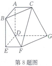 8.A[解析]因为平面$ABC \cap$平面$ABED = AB$,平面$DEFG \cap$平面$ABED = DE$,平面$ABC //$平面$DEFG$,所以$AB // DE$。又因为$AB = DE$,所以四边形$ABED$是平行四边形,所以$BE // AD$。因为$EF // DG$,$BE \cap EF = E$,$AD \cap DG = D$,所以平面$BEF //$平面$ADGC$。因为$BF \subset$平面$BEF$,所以$BF //$平面$ADGC$,故A正确;由于$DG = 2EF$,因此四边形$EFGD$是梯形,$GF$的延长线必与直线$DE$相交,故B,D不正确;选项C不能根据题意推知。故选A。