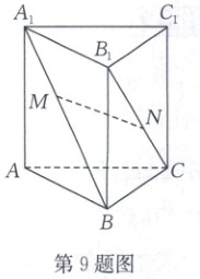 9.D[解析]如图,过点$M$作$MQ // AA_1$,交$AB$于点$Q$,过点$Q$作$QH // AC$,交$BC$于点$H$,过点$H$作$NH // BB_1$,交$B_1C_1$于点$N$。因为$BB_1 // AA_1$,所以$NH // MQ$,所以$M$,$Q$,$H$,$N$四点共面,又易得平面$MQHN //$平面$ACC_1A_1$,则$MN //$平面$ACC_1A_1$。因为$M$为线段$A_1B$上的动点,所以这样的$MN$有无数条。故选D。