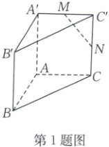 1.B 【解析】如图,连接A'C,A'B.因为AA'⊥平面ABC,AB=AC=AA'=1,所以A'B=A'C= $\sqrt{1^{2}+1^{2}}$ = $\sqrt{2}$.又因为AB⊥AC,所以BC= $\sqrt{1^{2}+1^{2}}$ = $\sqrt{2}$,故△A'BC是等边三角形.又因为M,N分别为A'C',CC'的中点,所以MN//A'C.又因为B'C'//BC,所以异面直线MN与B'C'所成的角和直线A'C与BC所成的角相同,为60°.