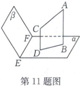 11. [2024·合肥二中月考]如图,设平面$α\cap β = EF,AB⊥α,CD⊥α$,垂足分别为 B,D. 如果增加一个条件,就能推出$BD⊥EF$,这个条件不可能是下面四个选项中的(