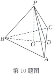 10.D [解析]因为$PO\bot$平面ABC,$AC\subset$平面ABC,所以$PO\bot AC$.又因为$AC\bot BD$,$PO\cap BD=O$,所以$AC\bot$平面PBD.因此平面PBD中的4条直线PB,PD,PO,BD都与AC垂直.故选D.