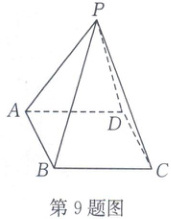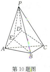 10.D [解析]因为PA = PD,E为AD的中点,所以PE⊥AD.又平面PAD⊥平面ABCD,平面PAD∩平面ABCD = AD,所以PE⊥平面ABCD,所以PE⊥AC,PE⊥BC,所以A,B成立.又PE⊂平面PBE,所以平面PBE⊥平面ABCD,所以C成立.若平面PBE⊥平面PAD,又因为平面PBE∩平面PAD = PE,AD⊥PE,则AD⊥平面PBE,必有AD⊥BE,此关系不一定成立.故选D.
