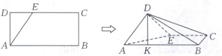 则NB = CE < 1.在Rt△AKD中,AD = 1,所以AK < 1,且DK² = AD² - AK² = 1 - AK²,所以点K在点N的左侧,则KN = 2 - AK - CE.由DK⊥AB,平面ABD⊥平面ABCE,且平面ABD∩平面ABCE = AB,所以DK⊥平面ABCE.又EK⊂平面ABCE,所以DK⊥EK.设AK = t,CE = x,x∈[0,1),则DE² = DK² + KE²,所以(2 - x)² = (1 - t²)+[(2 - t - x)² + 1],即t = $\frac{1}{2 - x}$∈[$\frac{1}{2}$,1),BK = AB - AK = 2 - t∈(1,$\frac{3}{2}$].