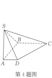4.$\frac{\sqrt{2}}{2}$ [解析]因为AB,CD共面,AD = $\frac{1}{2}$BC,故AB与CD必相交.设交点为E,连接SE,如图所示.因为AD//BC,BC = 2AD,所以EA = AB = SA,所以SE⊥SB.因为SA⊥平面ABCD,所以SA⊥AD.又AD⊥BE,BE∩SA = A,BE,SA⊂平面SBE,所以AD⊥平面SBE.又AD//BC,所以BC⊥平面SBE.所以SB是SC在平面SBE内的射影.又SE⊥SB,所以SE⊥SC,所以∠BSC是平面SCD与平面SBA所成二面角的平面角.在Rt△SBC中,tan∠BSC = $\frac{BC}{SB}$ = $\frac{1}{\sqrt{2}}$ = $\frac{\sqrt{2}}{2}$.