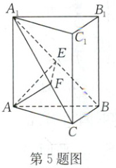 5.C[解析]由题意知在堑堵$ABC -A_1B_1C_1$中,$AC\perp BC$,侧棱$AA_1\perp$平面$ABC$,对于A,因为$AA_1\perp BC$,$AC\perp BC$,且$AA_1\cap AC = A$,所以$BC\perp$平面$AA_1C_1C$,且$AA_1C_1C$为矩形,所以四棱锥$B -A_1ACC_1$为“阳马”,故A正确;对于B,因为$A_1C_1\perp BC$,$A_1C_1\perp C_1C$,且$C_1C\cap BC = C$,所以$A_1C_1\perp$平面$BB_1C_1C$,所以$A_1C_1\perp BC_1$,则$\triangle A_1BC_1$为直角三角形,由$BC\perp$平面$AA_1C_1C$,得$\triangle A_1BC$,$\triangle CC_1B$为直角三角形,由“堑堵”的定义可得$\triangle A_1C_1C$为直角三角形,所以四面体$A_1 -C_1CB$为“鳖臑”,故B正确;对于C,在底面,有$4 = AC^2 + BC^2\geq 2AC· BC$,即$AC· BC\leq 2$,当且仅当$AC = BC$时取等号,则$V_{三棱锥B -A_1ACC_1} = \frac{1}{3}S_{矩形A_1ACC_1}· BC = \frac{1}{3}AA_1· AC· BC = \frac{2}{3}AC· BC\leq \frac{4}{3}$,故四棱锥$B -A_1ACC_1$的体积最大为$\frac{4}{3}$,故C不正确;对于D,由A知$BC\perp$平面$AA_1C_1C$,则$BC\perp AF$,又$AF\perp A_1C$,且$A_1C\cap BC = C$,则$AF\perp$平面$A_1BC$,所以$AF\perp A_1B$,又$AE\perp A_1B$,且$AF\cap AE = A$,所以$A_1B\perp$平面$AEF$,所以$A_1B\perp EF$,故D正确.故选C.