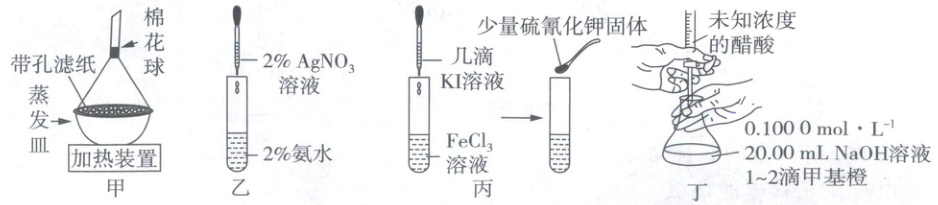 8.A实验装置分析 二茂铁易升华,图甲中加热蒸发皿,二茂铁升华,带孔滤纸可作为凝华的二茂铁载体,棉花球防止杂质进入,该简易装置可实现二茂铁的分离提纯,A正确;制银氨溶液应向AgNO₃溶液中逐滴滴加氨水至沉淀恰好溶解,图乙中试剂添加顺序错误,B错误;验证可逆反应需证明反应物和生成物同时存在,图丙中向FeCl₃溶液滴加几滴KI溶液,Fe³⁺过量,再加少量KSCN固体,溶液变红,是过量的Fe³⁺导致,无法证明反应可逆,C错误;用未知浓度的醋酸滴定NaOH溶液,终点产物为CH₃COONa,其水解使溶液显碱性,甲基橙的变色范围为pH3.1~4.4,应选酚酞作指示剂,D错误。