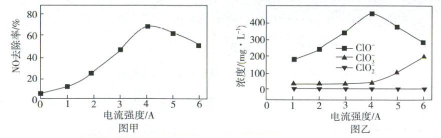 (4)3ClO⁻+2NO+2OH⁻=2NO₃⁻+3Cl⁻+H₂O(2分,未配平扣1分) 随着电流强度增大,导致次氯酸根转化为氯酸根,氯酸根氧化性弱于次氯酸根(2分,叙述合理即得分)