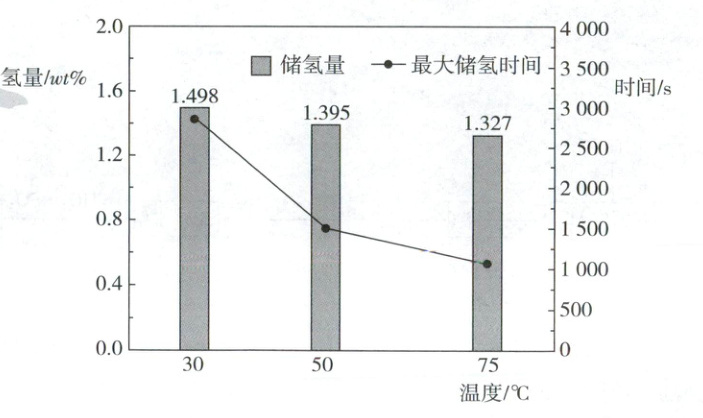 (6) 某La-Mg-Ni的储氢量和时间、温度的变化图像如下,其中储氢量(wt%)是指储存氢气和氢气总量的比值,从热力学角度分析该合金随温度的升高储氢量减小的原因是______,从生产效率角度分析此条件下储氢的温度宜选择______(填“30℃”“50℃”或“75℃”)。