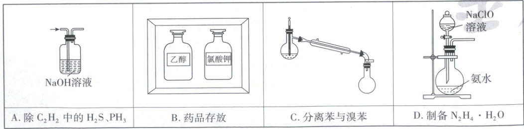3.D 实验基本操作 NaOH能与H₂S反应,不能与弱碱性的PH₃反应,故不能用NaOH除PH₃,除PH₃应用CuSO₄溶液,A错误;乙醇属于易燃的有机物,KClO₃是具有强氧化性的无机物,两者在实验室中要分开存放,B错误;通过蒸馏操作分离两种有机物时,温度计的水银球应放在蒸馏烧瓶的支管口处,C错误;NH₃被NaClO氧化生成N₂H₄·H₂O,N₂H₄·H₂O仍具有还原性,滴入的NaClO溶液不可过量,用分液漏斗滴加NaClO溶液可以控制用量,D正确。