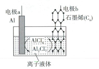 11.B电化学原理 由题给装置图及物质性质知,放电时电极a为负极、电极b为正极。充电时,电极a作阴极,连接外接电源的负极,电极b作阳极,连接外接电源的正极,则充电时电极b的电极电势较高,A错误;单质铝提供1mol电子需9g,单质锂提供1mol电子需7g,则新型铝 - 石墨烯电池的比能量小于锂电池的,B正确;“电子不下水,离子不上岸”,在电解质溶液中导电粒子不是电子,而是离子,C错误;由图知,放电时负极反应式为Al - 3e⁻ + 7AlCl₄⁻ ══ 4Al₂Cl₇⁻,正极上电极反应式为Cₙ(AlCl₄) + e⁻ ══ Cₙ + AlCl₄⁻,当电路中转移3个电子时石墨烯电极释放出3个AlCl₄⁻,结合负极反应式知,$\frac{n(AlCl₄⁻)}{n(Al₂Cl₇⁻)}$的值变小,D错误。