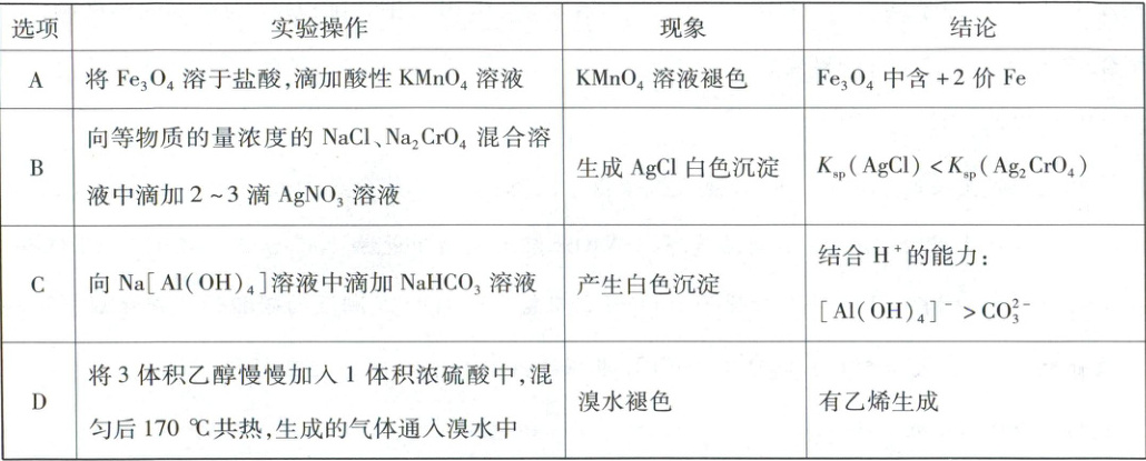 10.C实验方案设计和评价 酸性KMnO₄溶液既能氧化+2价Fe,也能氧化Cl⁻,A错误。AgCl和Ag₂CrO₄的组成类型不同,不能由此确定二者Kₛₚ相对大小,B错误。向Na[Al(OH)₄]溶液中滴加NaHCO₃溶液发生反应HCO₃⁻ + [Al(OH)₄]⁻ ══ Al(OH)₃↓ + CO₃²⁻ + H₂O,由此可知结合H⁺的能力:[Al(OH)₄]⁻ > CO₃²⁻,C正确。混合时应将3体积浓硫酸慢慢加入1体积乙醇中,体积比与混合操作均有错,且检验乙烯时须先除去杂质气体SO₂[提示:用NaOH溶液],D错误。