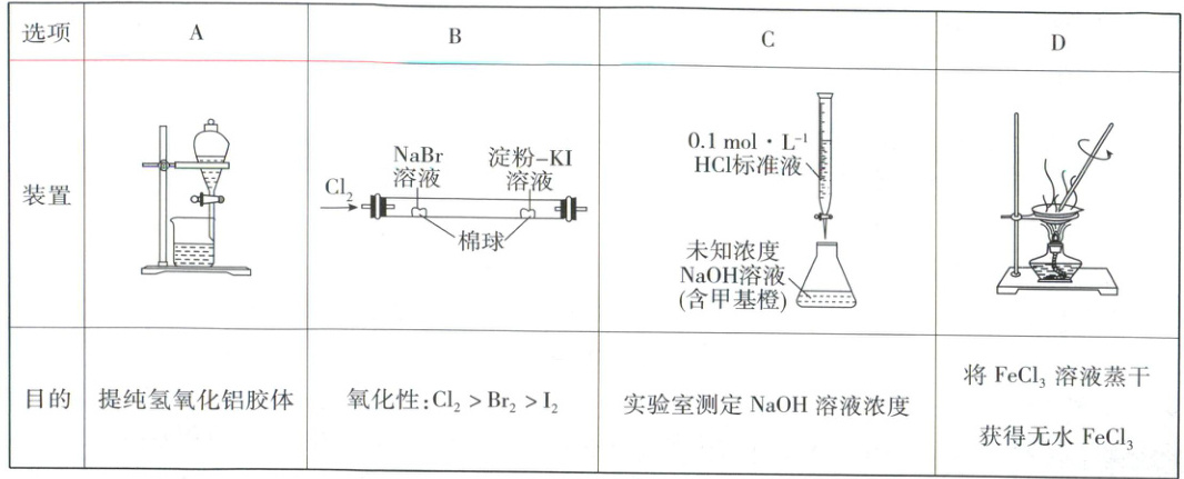 8.C 实验装置与实验基本操作的判断 提纯胶体应用渗析的方法,A错误;$Cl_2$先与NaBr反应,使含有NaBr溶液的棉球显橙色,说明$Cl_2$的氧化性强于$Br_2$,溴易挥发,与$Cl_2$一起与含有淀粉 - KI溶液的棉球反应,使含有淀粉 - KI溶液的棉球显蓝色,无法确定是哪种物质把$I^ - $氧化为$I_2$,B错误;甲基橙作指示剂,通过中和滴定,用$0.1mol· L^{ - 1}HCl$标准液可以测定NaOH溶液浓度,C正确;$FeCl_3$易水解生成氢氧化铁和HCl,HCl易挥发,直接加热促进了$Fe^{3 + }$水解,无法获得无水$FeCl_3$,D错误。