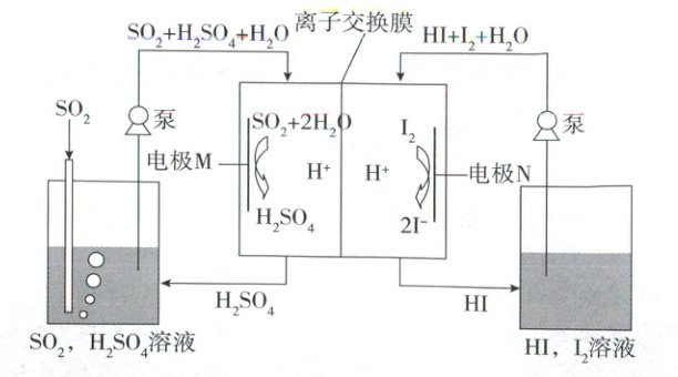 11.B 电化学原理 根据原理图可知,电极M上$SO_2$失电子和$H_2O$反应生成$H_2SO_4$,电极M为阳极,电极N为阴极,电极M的电极反应式为$SO_2 + 2H_2O - 2e^ - =SO_4^{2 - } + 4H^ + $,A正确;离子交换膜为质子交换膜,$H^ + $由电极M区通过离子交换膜移向电极N区,B错误;由B项分析可知,电极M区溶液的pH减小,$H^ + $通过离子交换膜转移至电极N区,则电极N区溶液的pH也减小,C正确;根据电池示意图可知,该电池的阳极电极反应式为$SO_2 + 2H_2O - 2e^ - =SO_4^{2 - } + 4H^ + $,阴极电极反应式为$I_2 + 2e^ - =2I^ - $,则电池总反应的离子方程式为$SO_2 + 2H_2O + I_2=2I^ - + SO_4^{2 - } + 4H^ + $,12.7g碘单质的物质的量为0.05mol,则消耗$SO_2$的物质的量为0.05mol,标准状况下$SO_2$的体积为1.12L,D正确。