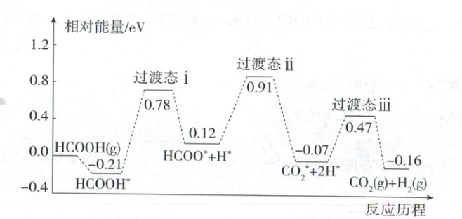 13.B 反应历程分析 产物总能量比反应物总能量低,说明正反应为放热反应,A正确;由反应历程图可知,该反应的决速步骤为$HCOOH^+=HCOO^ + + H^ + $,B错误;由反应历程图可知,$HCOOH^ + $的能量比$HCOOH(g)$的低,能量越低越稳定,C正确;正反应中最大活化能为0.99eV,逆反应中最大活化能为0.98eV,二者之差为0.01eV,D正确。