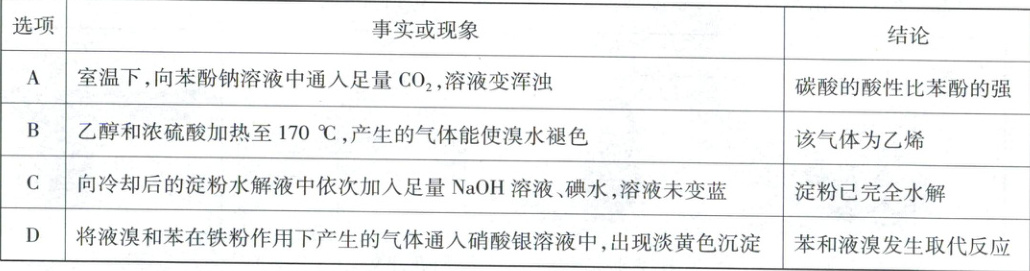 12.A 实验事实或现象及结论的判断 室温下,向苯酚钠溶液中通入足量$CO_2$,溶液变浑浊,说明有苯酚产生,因此碳酸的酸性强于苯酚的,A正确;乙醇和浓硫酸加热至170℃,产生的气体中含有$SO_2$等还原性气体杂质,$SO_2$也能使溴水褪色,不能依据实验现象证明该气体为乙烯,B错误;溶液中碘单质可以和过量的氢氧化钠反应,溶液未变蓝不能证明淀粉已完全水解,C错误;溴易挥发,生成的气体中含有溴蒸气,溴能和硝酸银溶液反应产生溴化银淡黄色沉淀,不能说明苯和液溴发生取代反应,D错误。