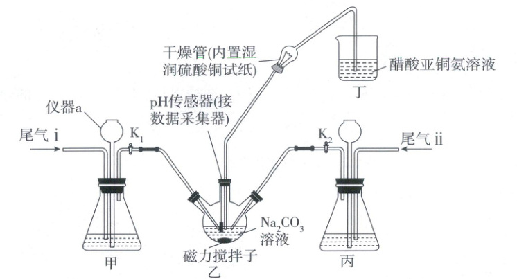 (2)实验时,先通入过量尾气i,再通入尾气ii。通入过量尾气i时,应打开活塞K₁, (填"关闭"或"打开")活塞K₂;干燥管内的湿润CuSO₄试纸的作用是 。