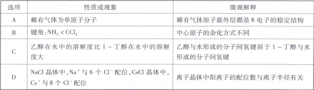7.D物质结构与性质稀有气体原子最外层是2电子或8电子的稳定结构,故稀有气体为单原子分子,A错误;NH₃的中心原子N的孤电子对数为$\frac{1}{2}$×(5−1×3)=1,价层电子对数为4,中心原子的杂化方式为sp³,CCl₄的中心原子C的价层电子对数为4+$\frac{1}{2}$×(4−4×1)=4,孤电子对数为0,中心原子的杂化方式为sp³,二者中心原子的杂化方式相同,NH₃的键角小于CCl₄的键角是因为NH₃中N原子上含有孤电子对,而CCl₄的中心原子C上没有孤电子对,孤电子对对成键电子对的排斥作用大于成键电子对之间的排斥作用,B错误;1−丁醇溶解度小于乙醇,是因为1−丁醇中的烃基更长,疏水性更强,C错误;离子晶体中阳离子的配位数与离子半径有关,Cs⁺半径大于Na⁺半径,故Cs⁺与8个Cl⁻配位,Na⁺与6个Cl⁻配位,D正确。