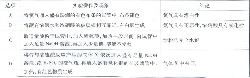 9.D 实验操作及现象、结论氯气没有漂白性,氯气与水反应生成的次氯酸使有色布条褪色,A错误;将蘸有浓氨水和浓硝酸的玻璃棒相互靠近,生成固体硝酸铵(不是氧化还原反应),不能说明氨气具有还原性,浓硝酸具有氧化性,B错误;向加入足量NaOH溶液的淀粉水解液中加入少量碘,碘能与过量的NaOH反应,溶液不变蓝不能说明淀粉已完全水解,C错误;锌与浓硫酸反应产生二氧化硫气体,随反应进行,浓硫酸变稀,锌与稀硫酸反应生成氢气,D正确。