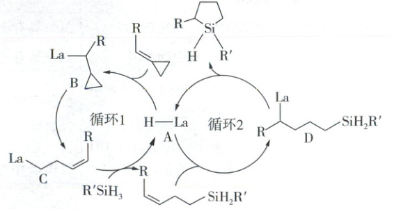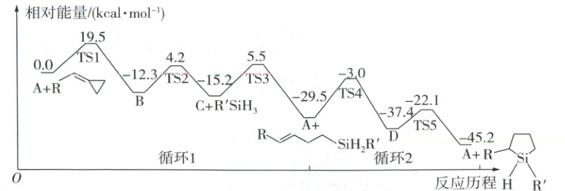 13. 我国科技工作者研发了通过稀土催化亚甲基环丙烷的选择性开环硅氢化串联反应得到硅杂环戊烷,反应机理和反应历程能量变化如图(其中R和R'均代表芳基)。下列说法错误的是