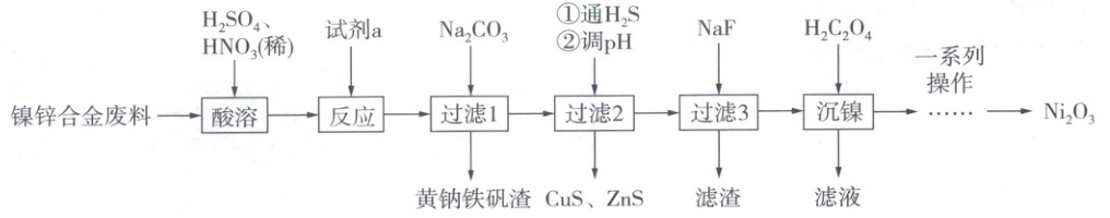 16. (15分)Ni₂O₃广泛应用于蓄电池、颜料等领域。以镍锌合金废料(主要含Ni、Zn、Mg、Fe、Cu等金属)为原料制取Ni₂O₃的工艺流程如图。