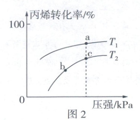 (2)将丙烯和氯气按相同比例,置于有相同催化剂的密闭容器中,在T₁、T₂(T₁ > T₂)下,相同时间内,丙烯的转化率随压强的变化关系如图2所示。