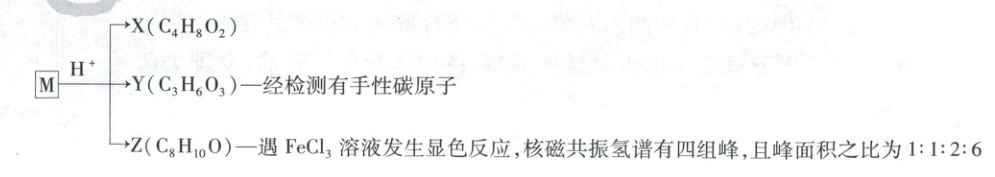 。②依据Y(C₃H₆O₃)经检测有手性碳原子,可知Y为H₃C—CH—COOH或H₃C—O—CH—CHO,而H₃C—CH—COOH可通过自身缩聚反应生成可降解塑料H₂N—CH—C—OH。③依题意可知,M在酸性条件下水解得到三种产物,且三种产物分子的碳原子数之和为15,氢原子数之和比M多4,说明M属于二元酯。依据Z(C₈H₁₀O)遇FeCl₃溶液发生显色反应,核磁共振氢谱有四组峰,且峰面积之比为1:1:2:6,可知Z为