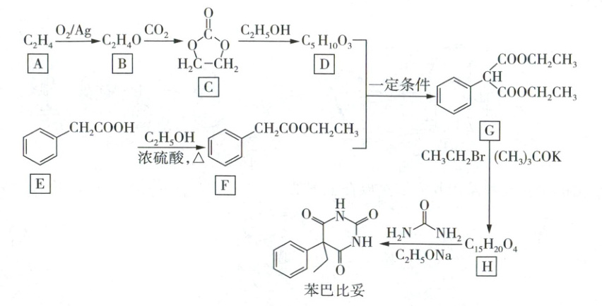 路线分析 根据分子式可知A为乙烯,乙烯被氧化生成环氧乙烷,故B的结构简式为H₂C—CH₂,环氧乙烷与CO₂发生开环加成反应生成C,C与乙醇发生类似已知信息的取代反应,结合D的分子式可知D的结构简式为CO(OCH₂CH₃)₂,D与F发生取代反应生成G,G与溴乙烷发生取代反应,将G分子中的H原子替换为乙基,故H的结构简式为