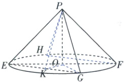 选项A:由已知可得 $PO = OE = OF = 3$,$PO\perp EF$(等腰直角三角形性质的应用),所以 $PE = PF = 3\sqrt{2}$,则圆锥 $PO$ 的侧面积 $S = \pi× OE× PE = \pi×3×3\sqrt{2} = 9\sqrt{2}\pi$,A正确。