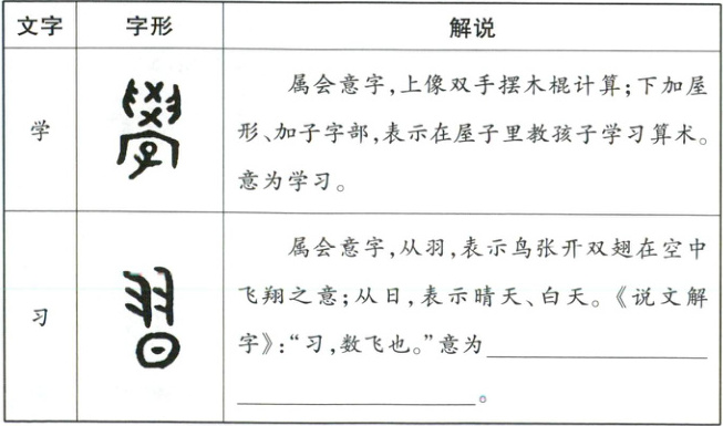 (2)参观博物馆时,文字馆讲解员介绍了“学”“习”两个字。请你根据解说推测“习”字的本义。