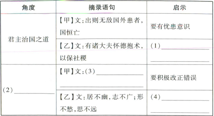 (1)空,要抓住给出的角度信息。摘录的[乙]文语句语境是越王认为自己为吴虏,越国诸臣心怀道德、胸有谋略,可以保卫国家,据此可知君王治国要任用贤才。作答第