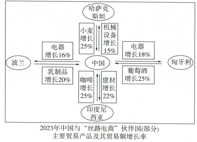 3 示例:2023年中国与“丝路电商”伙伴国进出口贸易额均呈增长趋势;出口贸易以电器和机械设备等工业制品为主;进口贸易以乳制品和粮食等原材料为主。