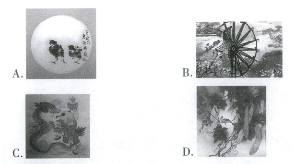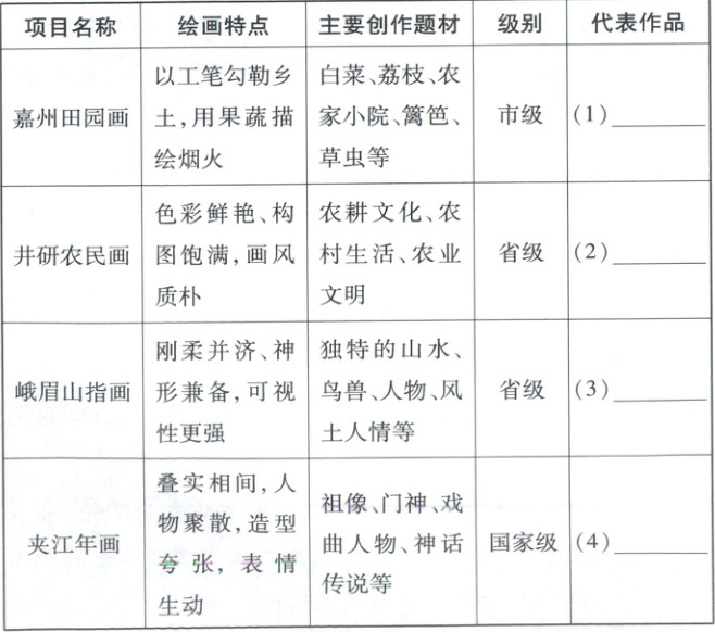 3. (2025 乐山)“非遗文化进校园”活动准备选取部分非物质文化遗产项目美术作品放入“笔墨绘乡情”主题板块,请你根据不同项目知识选择相应的作品填入表格。