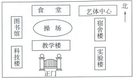 2. (2025 绥化)决赛时,学校邀请选手的亲友作为嘉宾来观看比赛,比赛地点在艺体中心。请你根据校园平面图(见下图),向你的亲友介绍从学校正门前往比赛地点的路线。(不得出现真实姓名)
