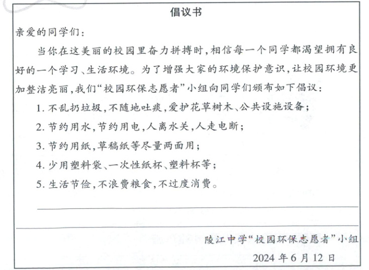 (1)上面是陵江中学“校园环保志愿者”小组草拟的环保倡议书,其中有两处问题,请找出并改正。