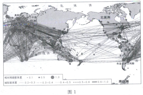 【深度解析】从图中可以看出,高端航运服务业全球网络联系度形成了以伦敦、新加坡、中国香港等城市为核心的空间格局,呈现出多核心的结构模式,C正确。