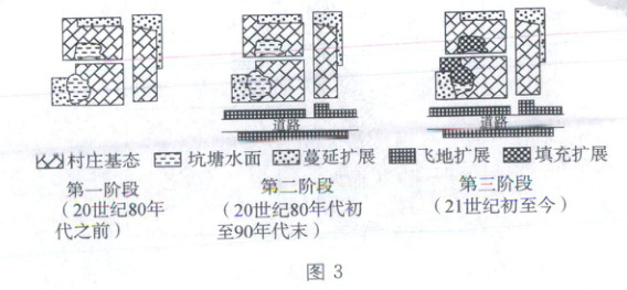 【深度解析】读图可知,赵庄村扩展的第一阶段到第二阶段在空间上主要通过飞地扩展向南发展,第二阶段到第三阶段在空间上主要通过填充扩展向西发展,D正确。