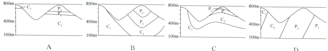 |B|从整体来看,C2层普遍呈山谷形态,其他的C1、P1、P2地层相对C2层而言更高(呈山脊形态),推测C2层易受侵蚀,因此②处是因差异侵蚀形成的谷地|正确|