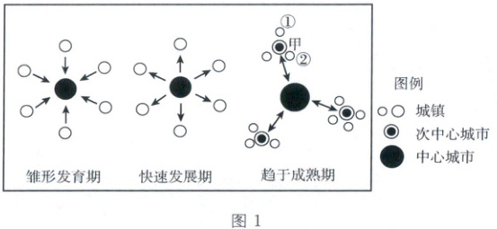 都市圈由中心城市及其外围社会经济联系密切的区域构成。图 1 示意都市圈发展的一般模式。据此完成 5~7 题。