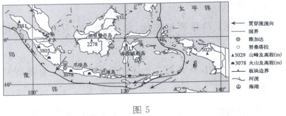研究发现,西太平洋到东印度洋因海面压力梯度差推动表层海水运动形成印尼贯穿流。印尼贯穿流的强弱与季风、厄尔尼诺和拉尼娜现象等因素密切相关。图5示意印尼贯穿流流向。据此完成13~15题。