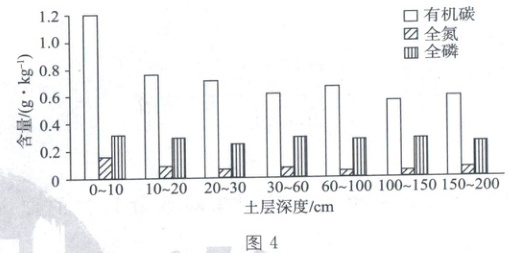 土壤有机碳是通过微生物作用所形成的腐殖质、动植物残体和微生物体的合称。通过对腾格里沙漠东北缘飞播造林区的研究,学者发现属于豆科灌木的花棒群落对土壤养分的恢复作用明显。图4示意花棒群落恢复后土壤中有机碳、全氮、全磷含量垂直分布特征。据此完成10~12题。
