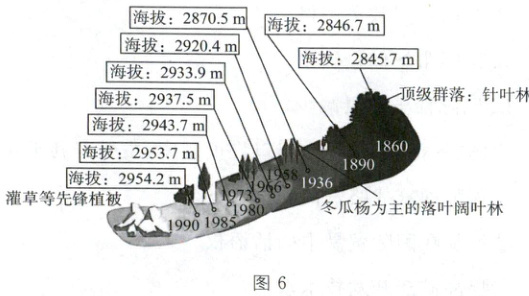 (2)早期冰川退缩区因土壤肥力低,主要生长以灌草为主的先锋植被;随着先锋植被对自然环境的改造,以冬瓜杨为主的落叶阔叶树种逐渐代替灌草等先锋植被,形成了落叶阔叶林;因海螺沟整体气温较低,针叶林竞争力更强,阔叶林逐渐向针叶林演替,最终形成以针叶林为主的顶级群落。(每条2分,共6分,其他合理表述亦可酌情给分)