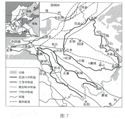 (1) 说出黄河冲积扇泥沙主要来源(地形区),并概述黄河冲积扇的形成过程。(9 分)