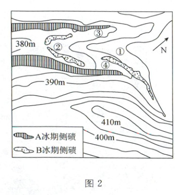 冰川对地貌的塑造作用强烈,当两条冰川在运动过程中发生汇合时,原有的侧碛(冰川退缩后在冰川体两侧形成的条状高地)在交汇处合并形成中碛。图 2 为山东某地第四纪两次冰期冰碛物分布图。据此完成 14~15 题。