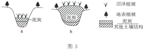 物质来源 由材料可知,植物残体堆积形成厚层泥炭,亚寒带气候夏季温暖,能为沼泽植被生长提供所需热量,使得沼泽植被生长旺盛,从而有较多的有机质形成