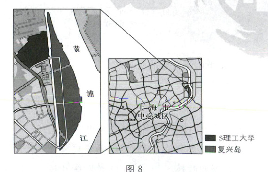 黄浦江中的复兴岛(图8),仅通过南北两端桥梁与西侧中心城区陆路相连。复兴岛以造船、渔业、仓储等产业为主,因传统产业萎缩、生态空间割裂等原因,被上海市列为“战略预留区”。2025年起,当地计划以复兴岛为基地,集聚大量高校、科研院所、头部企业及行业机构,打造智能制造、创意设计、在线新经济等三大产业集群,将复兴岛建设成“数字智能岛、设计艺术岛、人民城市岛”。图8示意复兴岛、S理工大学在上海市区的位置。